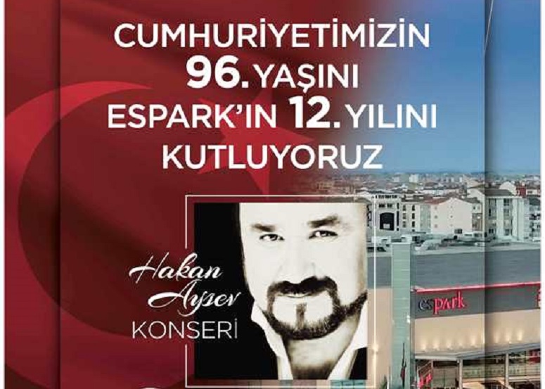 e-Haber Ajansı (e-ha) editörünün edindiği şekilde göre; Espark Alışveriş Merkezi, 30 Ekim'de muhteşem bir konsere ev dekorasyonu yapıyor. Cumhuriyet Bayramı ve Espark Alışveriş Merkezi'nin 12. yıldönümüümünü yapanları konserde yapıyorken, ünlü opera sanatçısı Hakan Aysev sahne alıyor. Saat 19.00'da Espark etkinlikleri düzenlemeecek konserde Hakan Aysev, zengin repertuarında yer alanı sevilen şarkılarıla konseri izleyenlere uzun süre akıllardan silinmeyecek bir akşam yaşatacak.