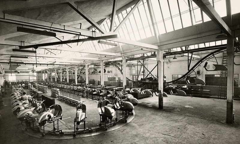1884’te kurulan Piaggio şirketinin bir markası olan ve bireysel ulaşıma yenilikçi bir çözüm yaratma arzusuyla doğan Vespa, ilk olarak paraşütçü motosiklet modeli üzerine bir “motorlu scooter” olarak tasarlandı. Ardından gövde, çamurluklar ve tüm mekanik aksamı kapatan bir motor kapağından oluşan bütünleşik bir yapıyla, klasik motosiklet dizaynında devrim yarattı. Bu kapsamda gidon üzerinden vites değişimi ve doğrudan tahrikli, son derece dayanıklı bir motosiklet tasarlandı. Klasik ön çatal, lastik değişimini kolaylaştıran tek taraflı bir salıncağa yerini bıraktı ve ayrıca iskelet de yok edildi. Gövdede ise sürücüyü ve giysilerini kir ve buruşmadan koruyan bir tasarım dizayn edildi. İlk patent başvurusu ise 23 Nisan 1946 tarihinde gerçekleşti. Böylece 98 cc’lik 2 zamanlı tek silindirli motora sahip ilk scooter, Toskana’daki Pontedera fabrikasında üretilmiş oldu.