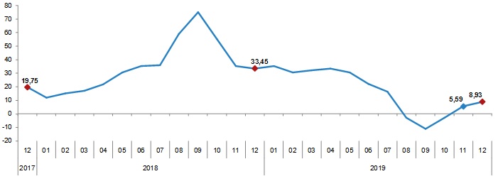 TÜİK, “Aralık 2019, Yurt Dışı Üretici Fiyat Endeksi”ni açıkladı. Buna göre, sanayinin iki sektörünün yıllık değişimleri; madencilik ve taş ocakçılığında %13,41, imalatta %8,83 artış olarak gerçekleşti. Ana sanayi gruplarının yıllık değişimleri; ara malında %5,92, dayanıklı tüketim malında %11,17, dayanıksız tüketim malında %9,63, enerjide %24,78, sermaye malında %10,27 artış olarak gerçekleşti. Sanayinin iki sektörünün aylık değişimleri; madencilik ve taşocakçılığında %1,04, imalatta %1,82 artış olarak gerçekleşti.